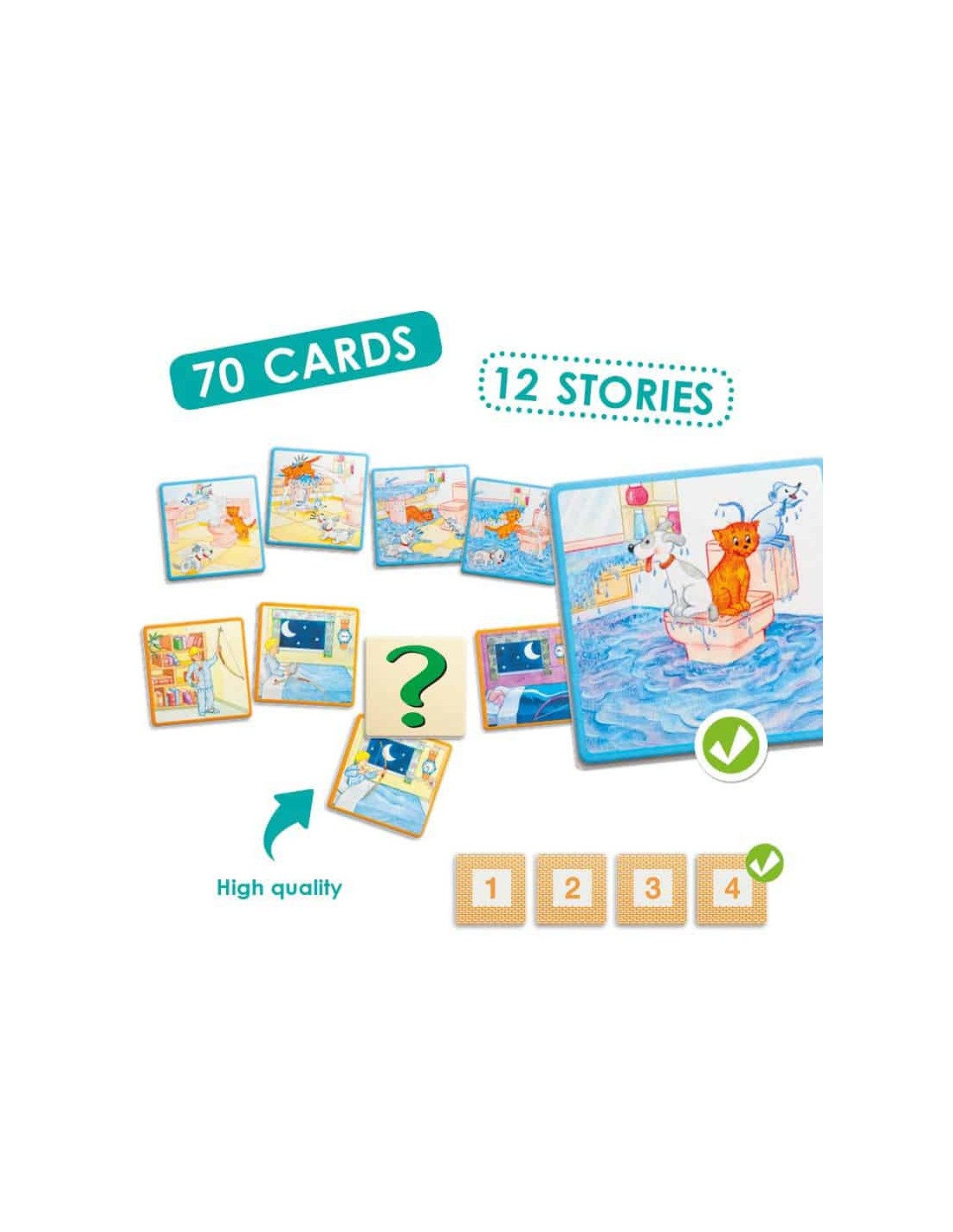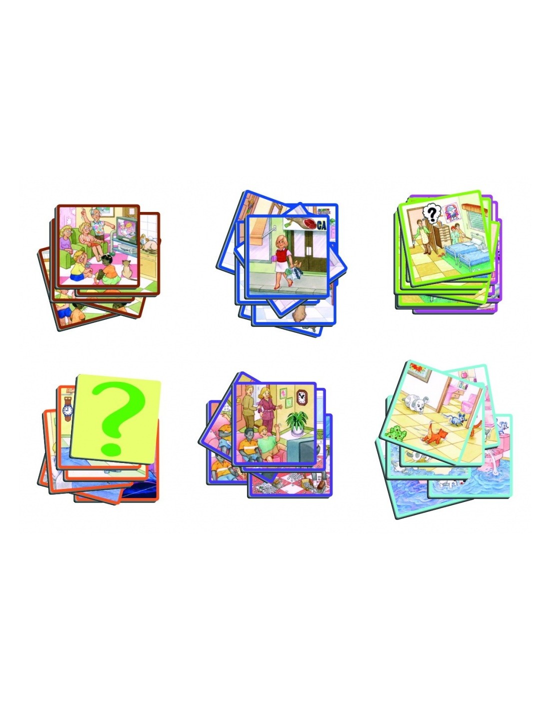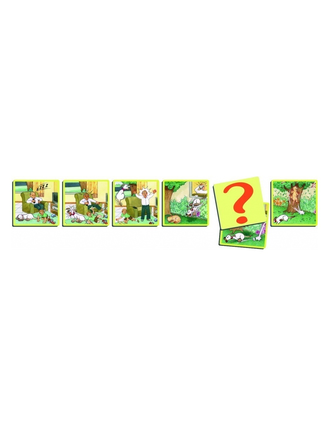 Jocul se compune din 70 carti cu desene care contine: 12 povestiri amuzante despre diferite situatii anecdotice care se desfasoara pe fundalul unei case si carti-interogative care servesc la inlocuirea anumitor scene si pentru a fi asezate la sfarsitul povestirilor, permitand astfel copilului sa-si imagineze un sfarsit diferit.