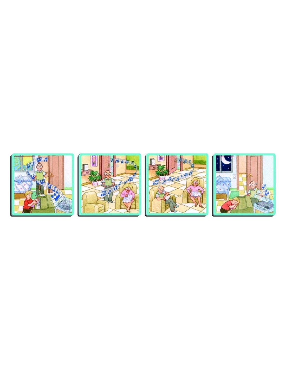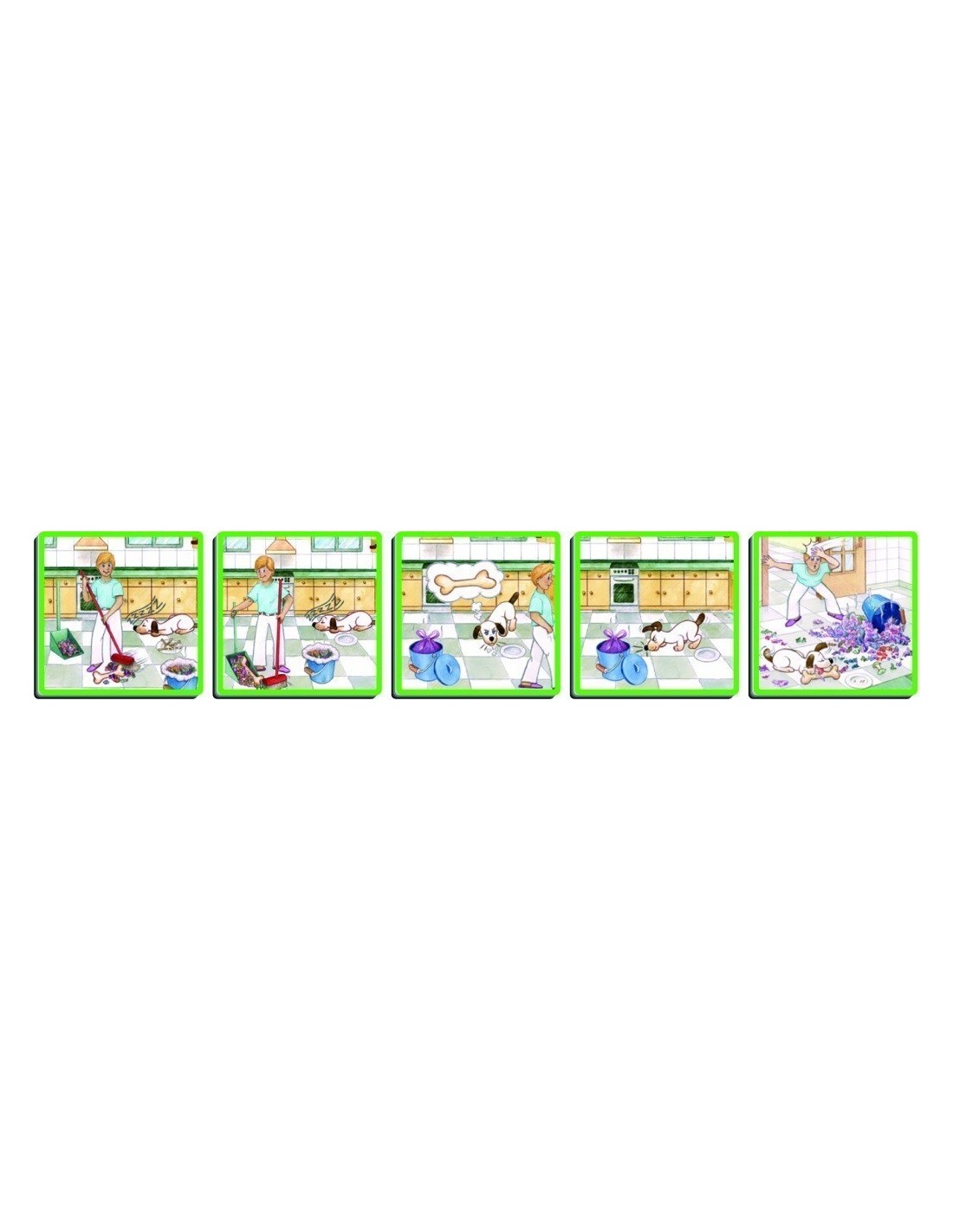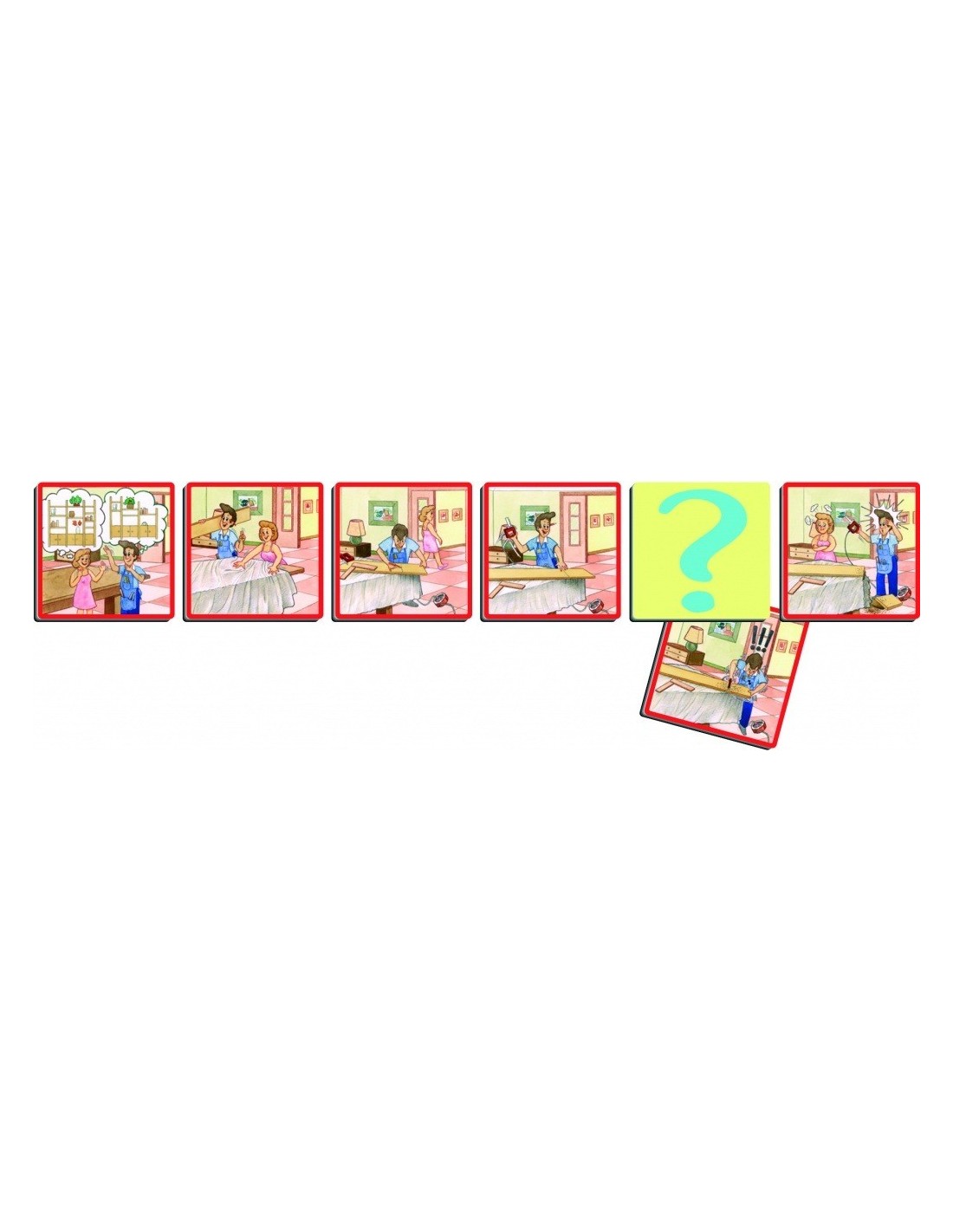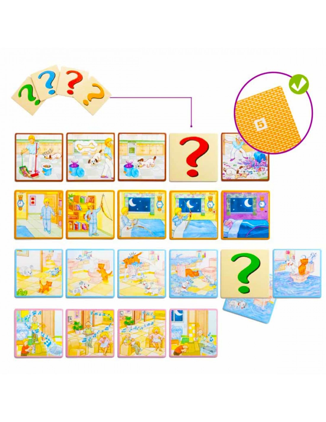 Jocul se compune din 70 carti cu desene care contine: 12 povestiri amuzante despre diferite situatii anecdotice care se desfasoara pe fundalul unei case si carti-interogative care servesc la inlocuirea anumitor scene si pentru a fi asezate la sfarsitul povestirilor, permitand astfel copilului sa-si imagineze un sfarsit diferit.