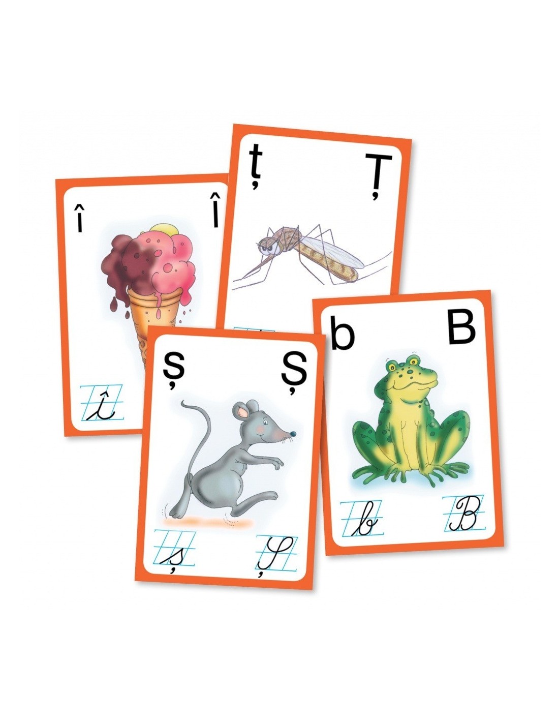 Setul contine 32 de planse cu toate literele alfabetului (de tipar si de mana). Plansele au fost gandite astfel incat sa poata fi folosite atat in unitatile de invatamant prescolar, dar si in scoala. Fiecare litera a alfabetului are o reprezentare grafica a unui cuvant, cat mai aproape de realitatea imediata a copilului. Grafica este atractiva si specifica particularitatilor de varsta carora li se adreseaza. Materialul a fost conceput astfel incat educatorul sa poata atinge obiective ca dezvoltarea auzului fonematic, recunoasterea literelor alfabetului, identificarea sunetului initial al unui cuvant dat. Recomandam folosirea acestui material atat in activitatile de educarea limbajului si alese (in gradinite), dar si in lectiile de abecedar si scriere specifice clasei I.