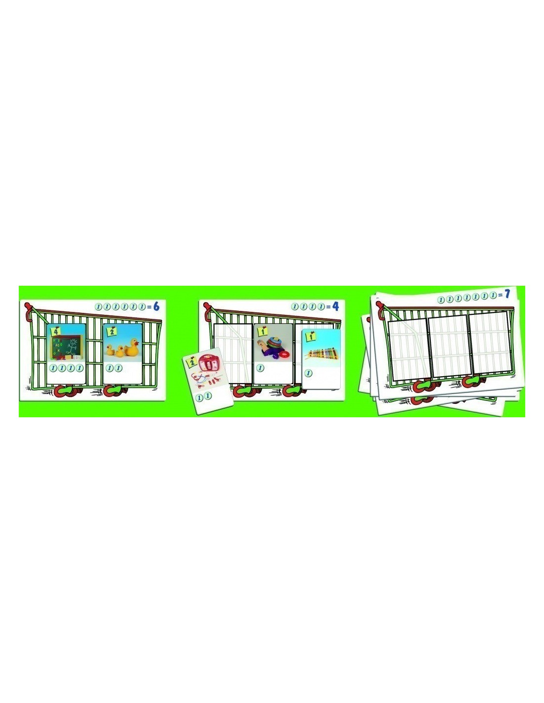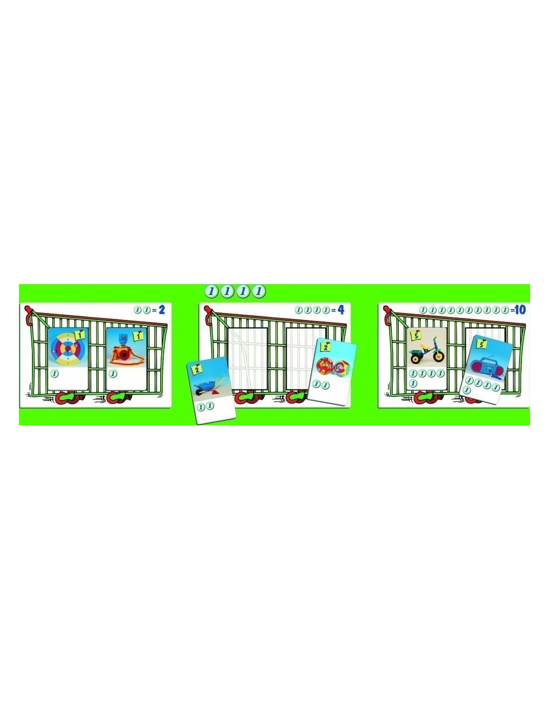 Fiecare copil ia o carte care arata caruciorul pentru cumparaturi cu un numar de monede aratate in partea superioara a cartii, si ridica numarul de monede indicat.