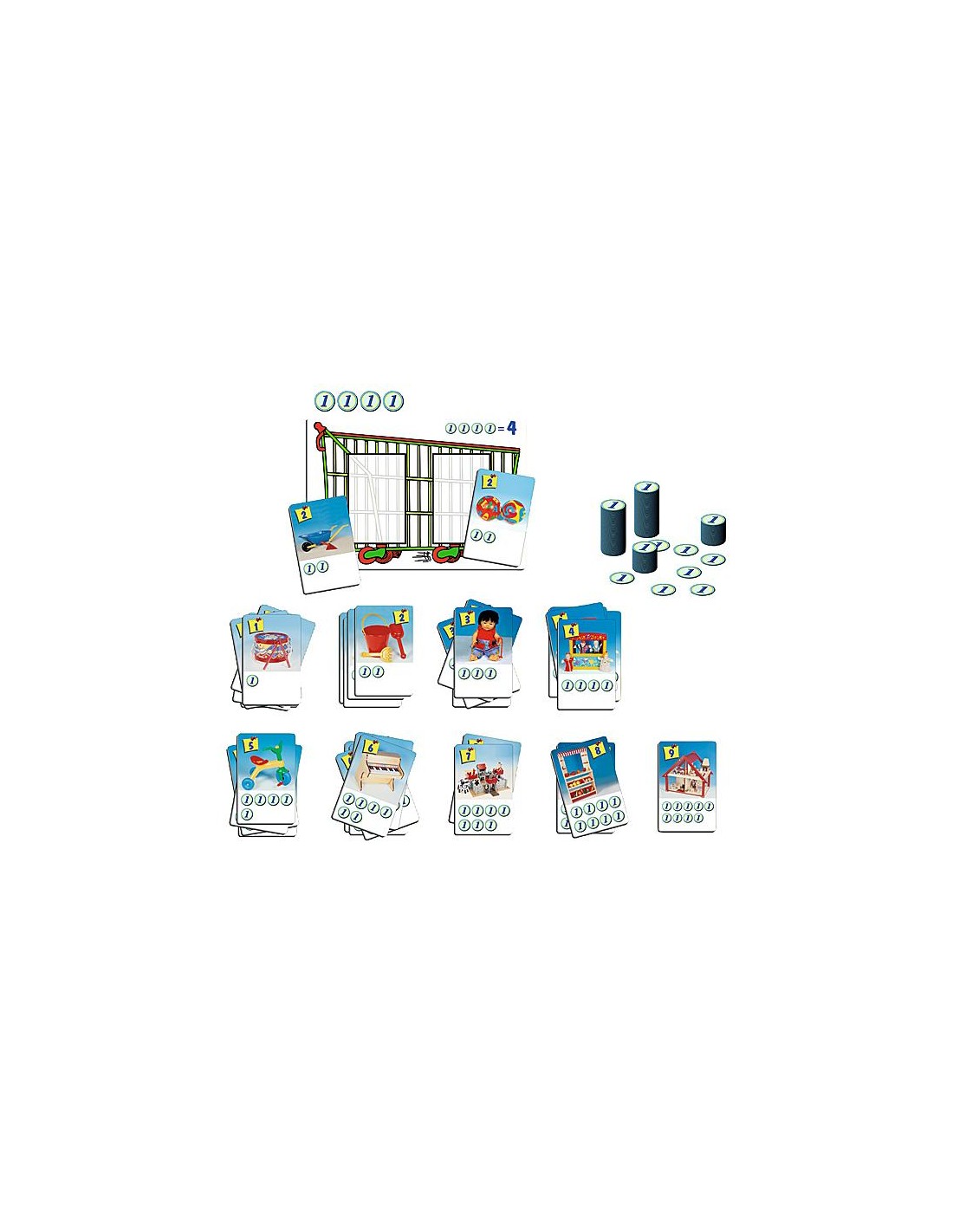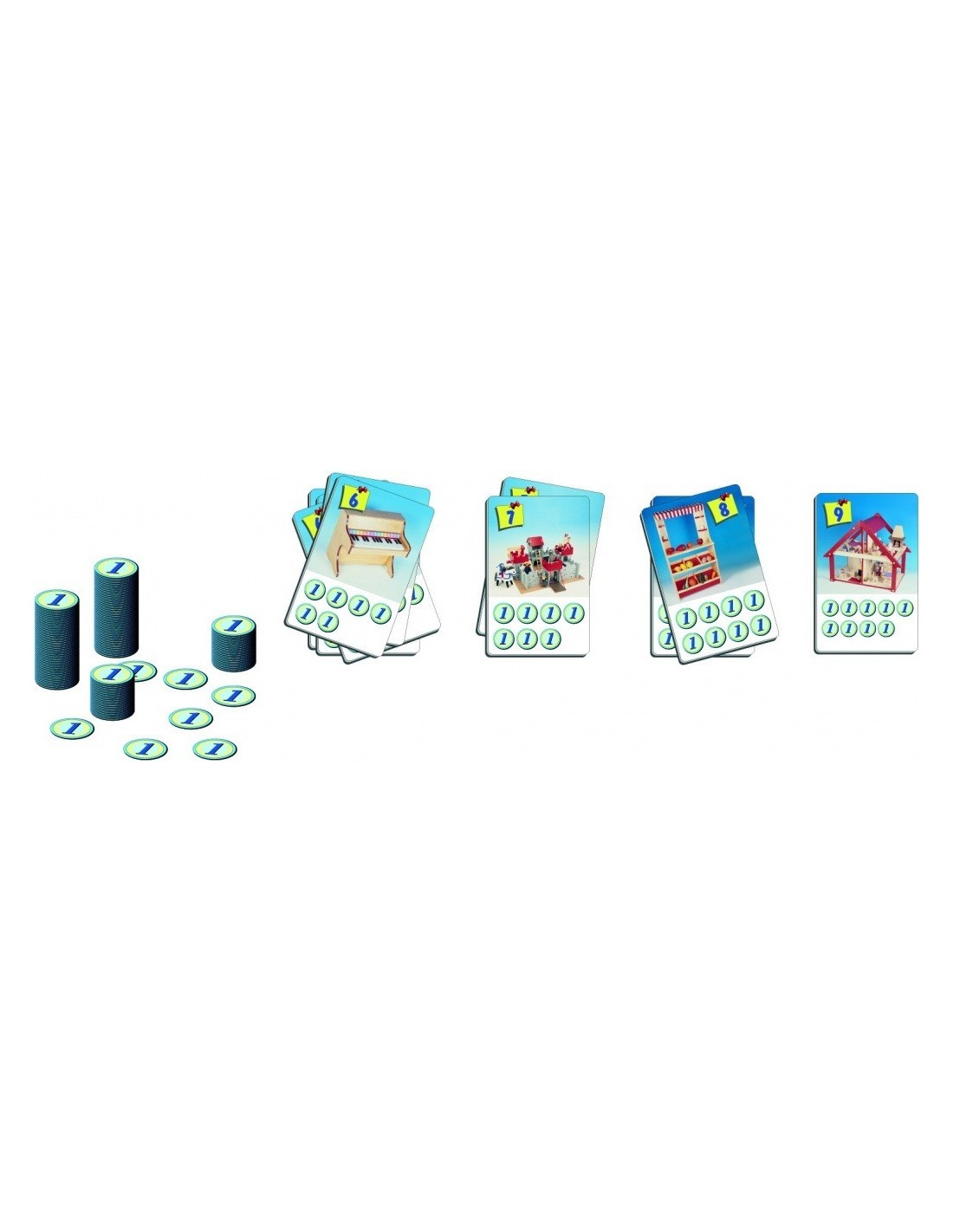 Jocul contine 12 carti cu caruciare + 55 carti cu jucarii + 75 monede .