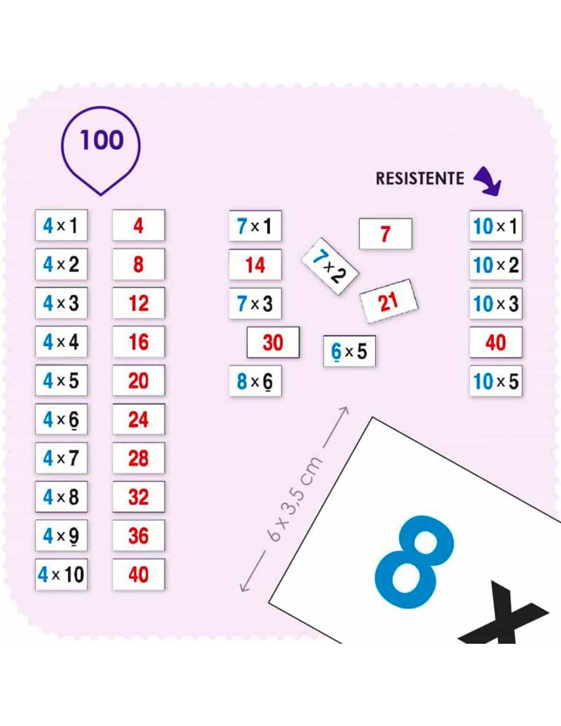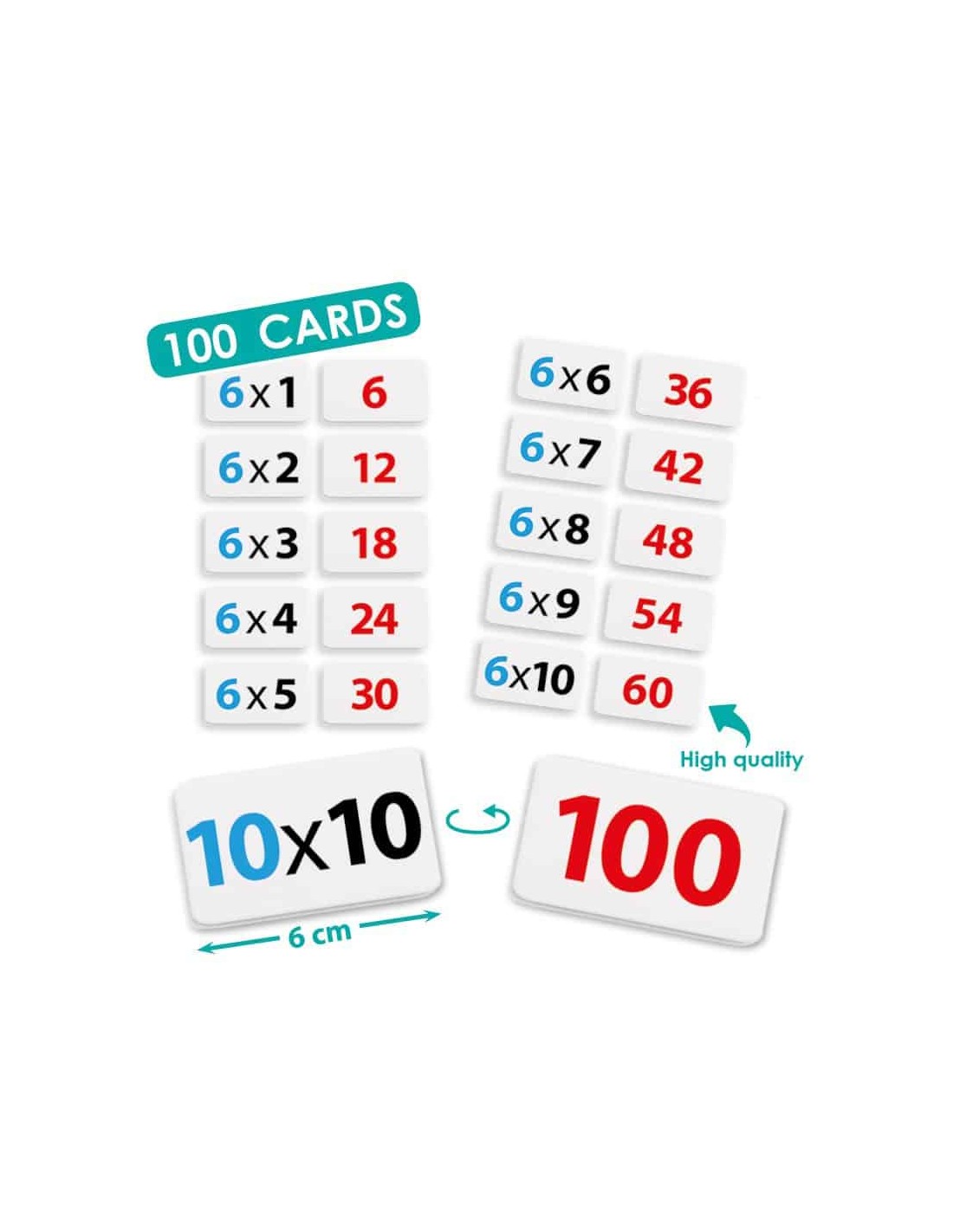 Pe fata sunt imprimati cei doi termeni ai inmultirii, in albastru si negru, iar pe dos rezultatul, in rosu.