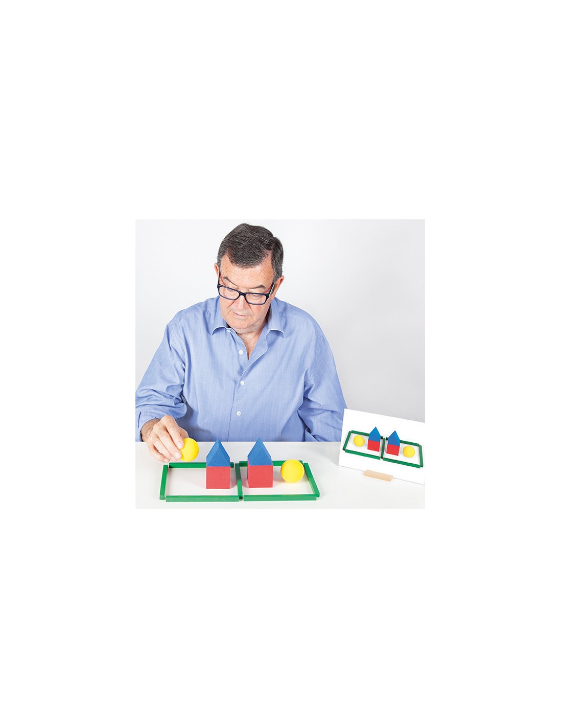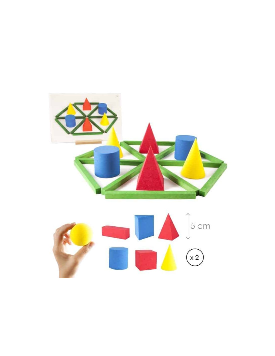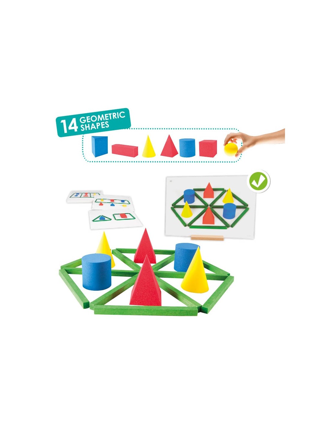 Jocul este format din 14 corpuri geometrice ( 2 seturi de cate 7 elemente), 50 de fotografii-model si 15 bare lungi.