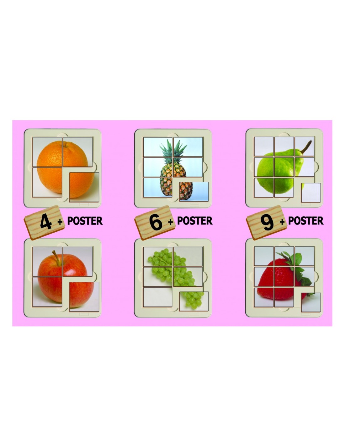 Puzzle pentru copii, facute din lemn, cu fotografii. Este compusa din 6 puzzle cu un numar crescator de piese : doua puzzle cu 4 piese, doua puzzle cu 6 piese si doua puzzle cu 9 piese. Contine un afis-ghid care reproduce puzzle-ul in marime naturala.