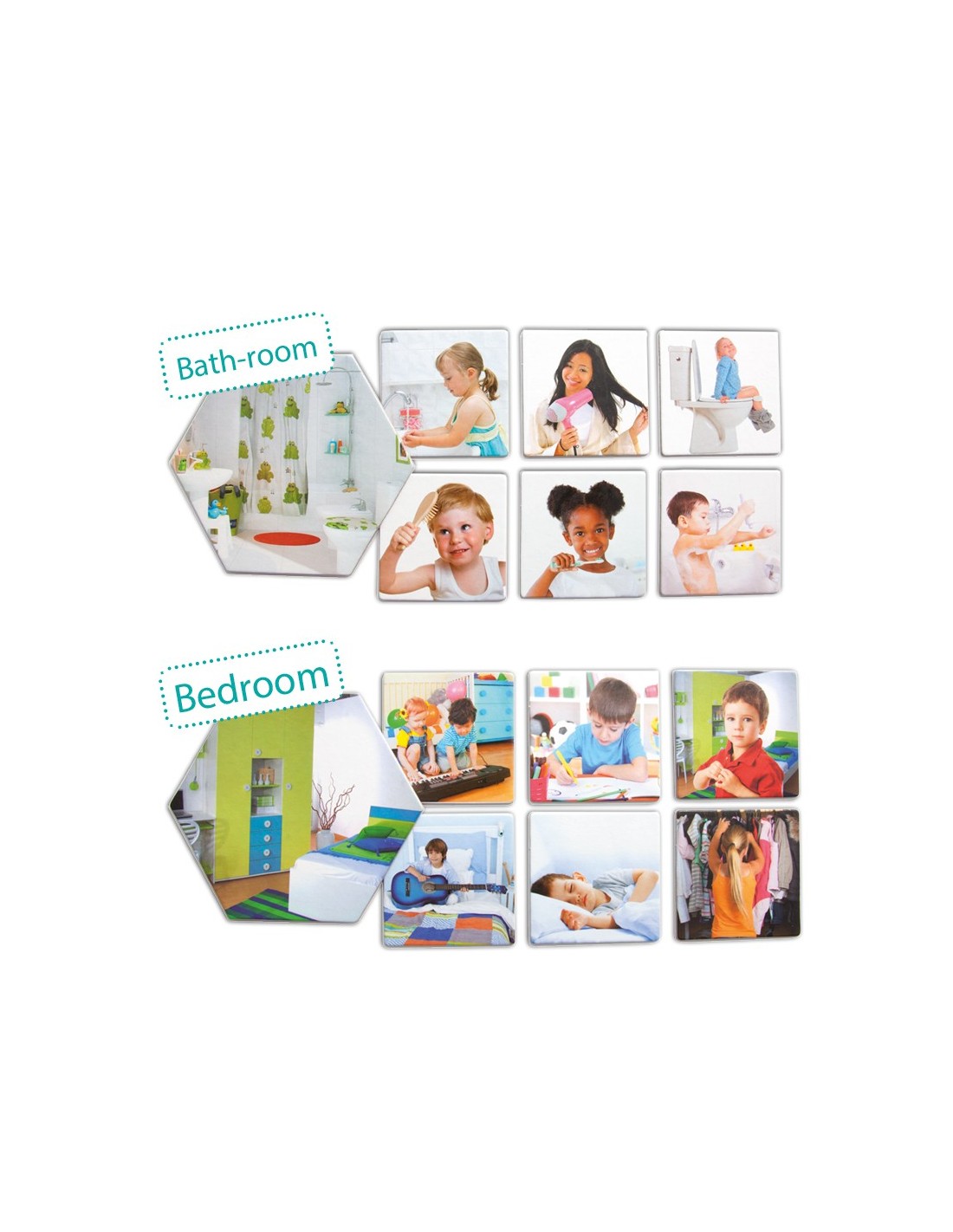 Contine 5 planse in forma de hexagon (dim. latura 7,5 cm.) cu locurile reprezentative ale casei, 30 de carduri cu activitati (dim. 7,5 x 7,5 cm.) si un zar.