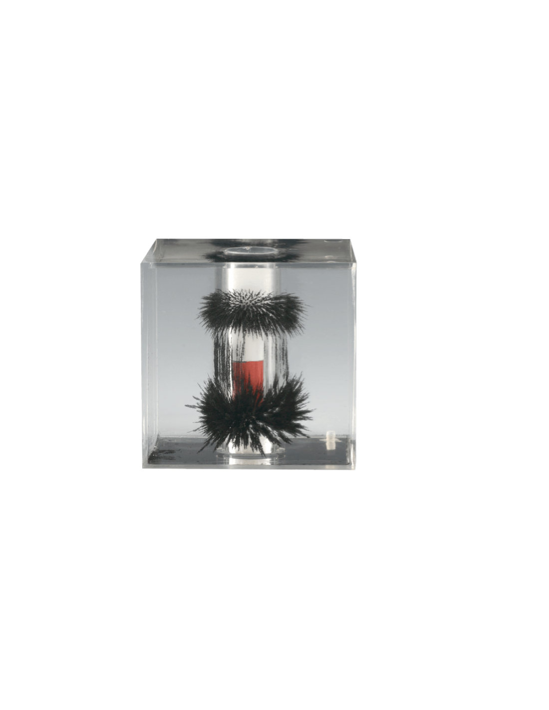 Între polii magnetului se găseşte un inel din fier moale. Fierul moale modifică structura câmpului în interiorul lui liniile de câmp sunt mai dese decât în aer. Deci fierul are o permeabilitate mai mare decât cea a aerului, adică a vidului. În interiorul inelului nu sunt linii de forţă, deci inelul ecranează câmpul magnetic. Contine:- cub 10x10x10cm