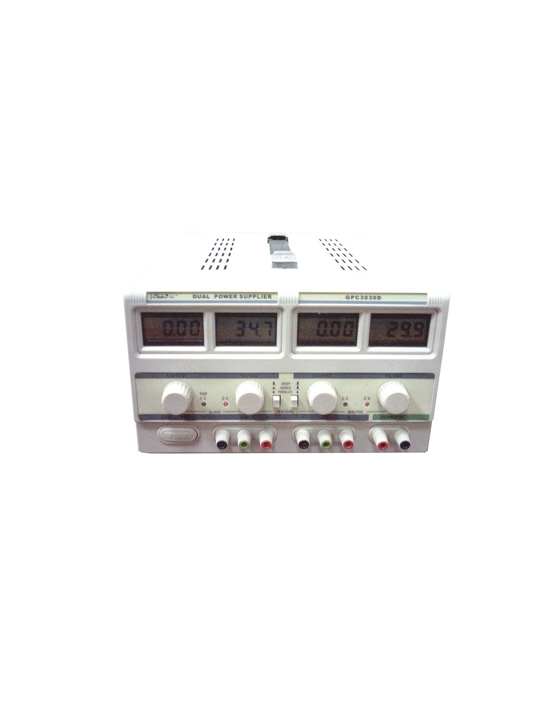 Sursă de energie, prezintă în componenţa sa două surse de curent electric continuu independente, ajustabile la 0~30V, 0~5A; cât şi o sursă fixă de 5V, 3A. Cele două producţii independente pot fi conectate în serie sau în paralel. Cu protecţie pentru supra-încarcare.