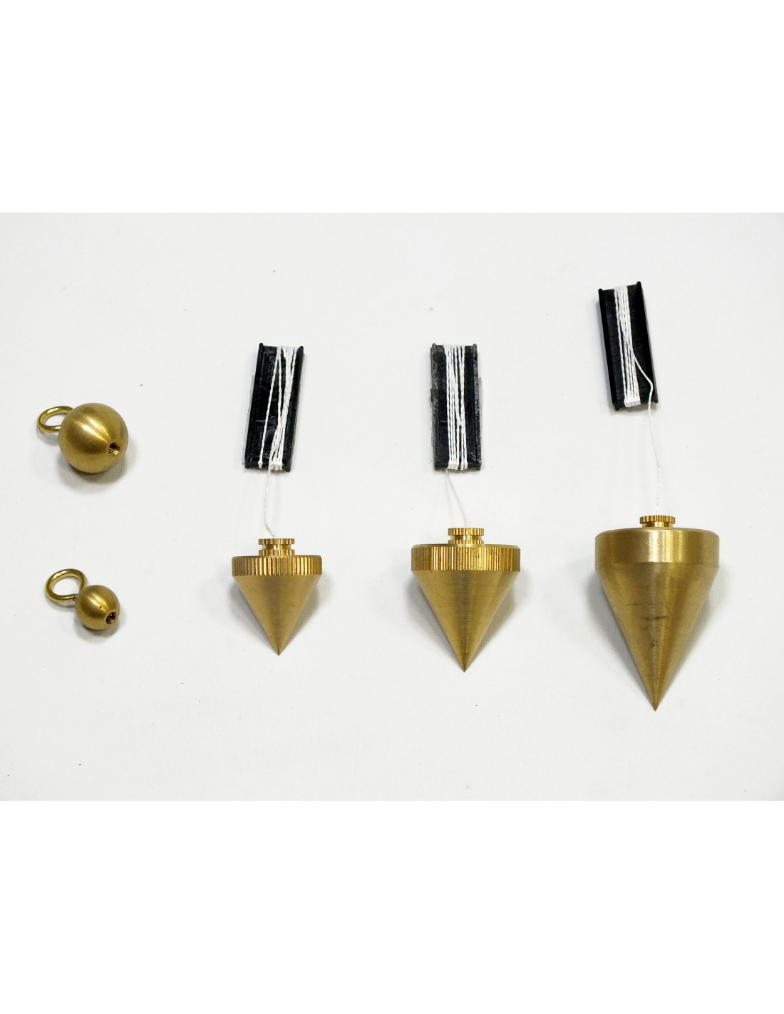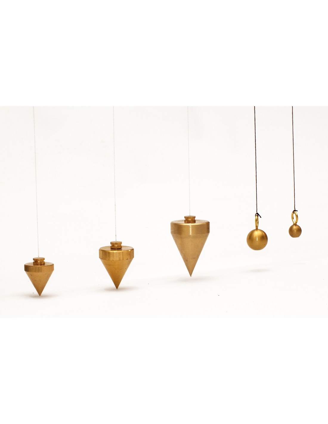 Set pendule format din 5 piese. 3 corpuri de pendul: 1. Ø 28 mm, lungime 41 mm, greutate 94 g. 2. Ø 24 mm, lungime 29 mm, greutate 49 g. 3. Ø 20 mm, lungime 23 mm, greutate 25 g. 2 bile de pendul: Ø 16 mm / greutate 16 g. Ø 10 mm / greutate 10 g. Material: alama