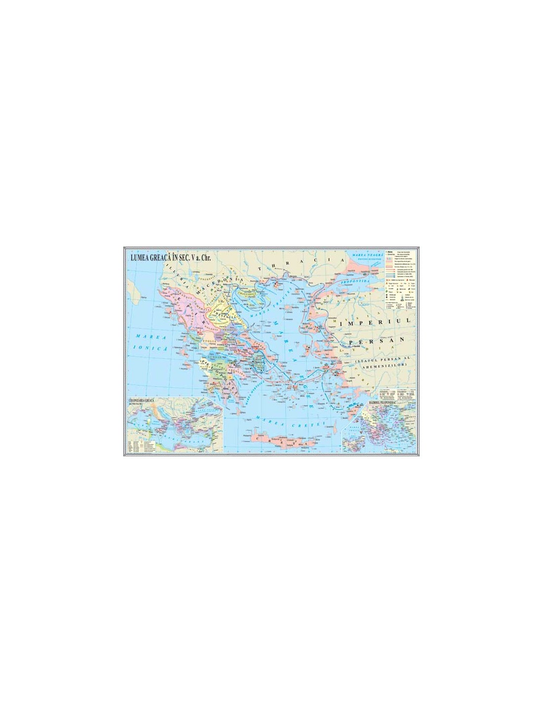 Harta surprinde dinamica lumii greceşti în secolul al V-lea î. Chr., cu două medalioane importante: Colonizarea greacă (sec.VIII-VI î. Chr.) şi Războiul peloponesiac. (silk dublu laminat, folie 25 microni, şipci de lemn, dimensiuni: 140x100 cm)