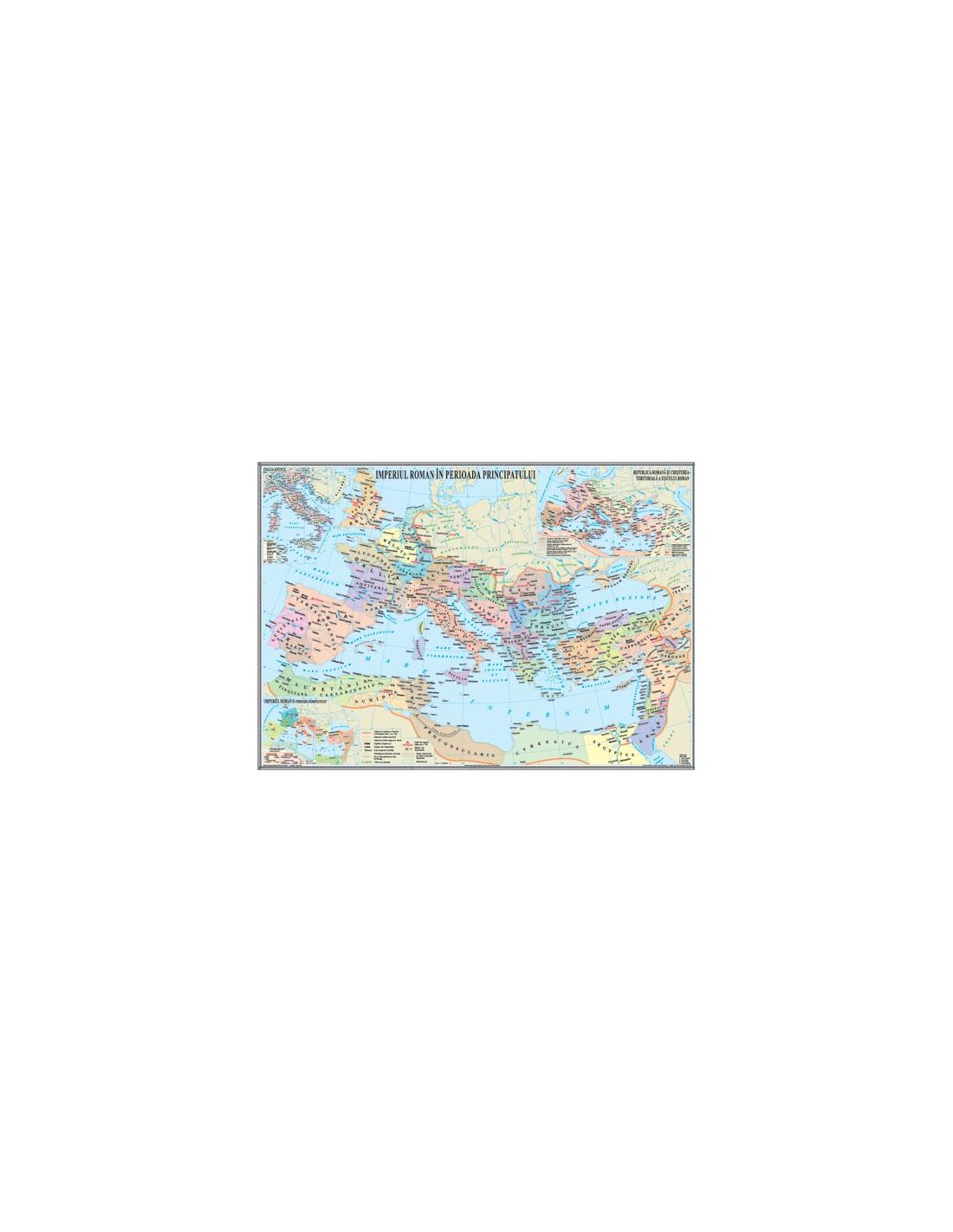 Harta surprinde dinamica transformărilor teritoriale ale Imperiului Roman în perioada principatului.(silk dublu laminat, folie 25 microni, şipci de lemn, dimensiuni: 140x100 cm)
