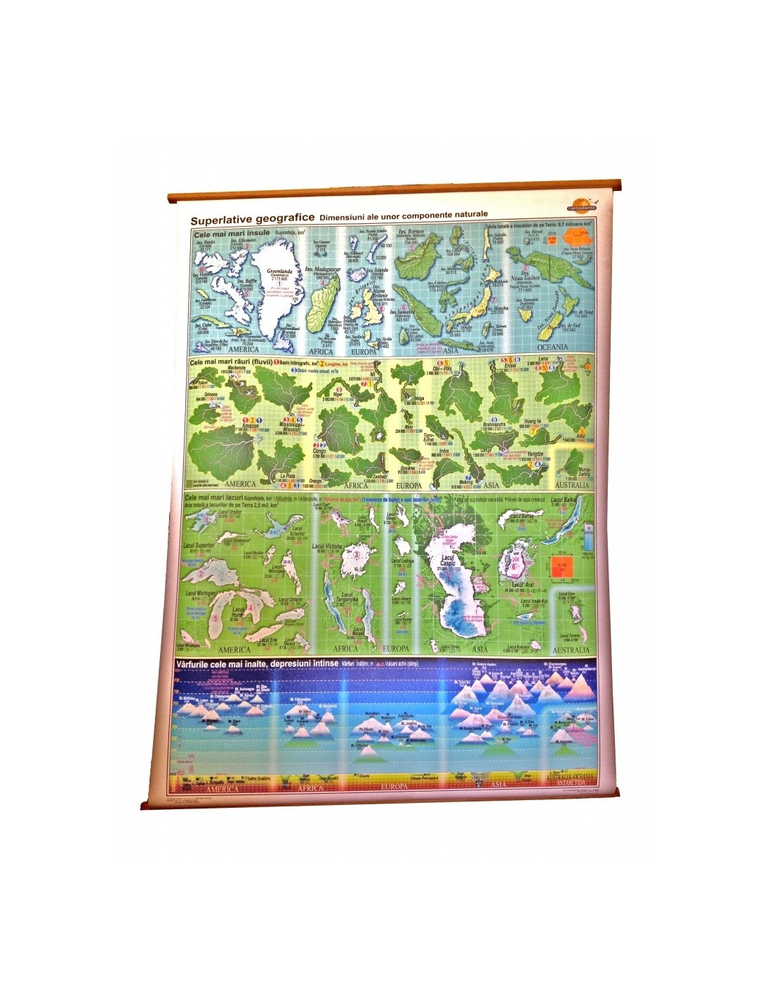 Hărţile sunt învelite în folie mată UV, pentru protejarea calităţii culorii. Pe folia de protectie se poate scrie, respectiv se poate şterge scrisul cu uşurinţă. Hărţile sunt dotate cu întăritură de lemn, respectiv sfoară de agăţare. Dimensiune: 100 x 140 cm