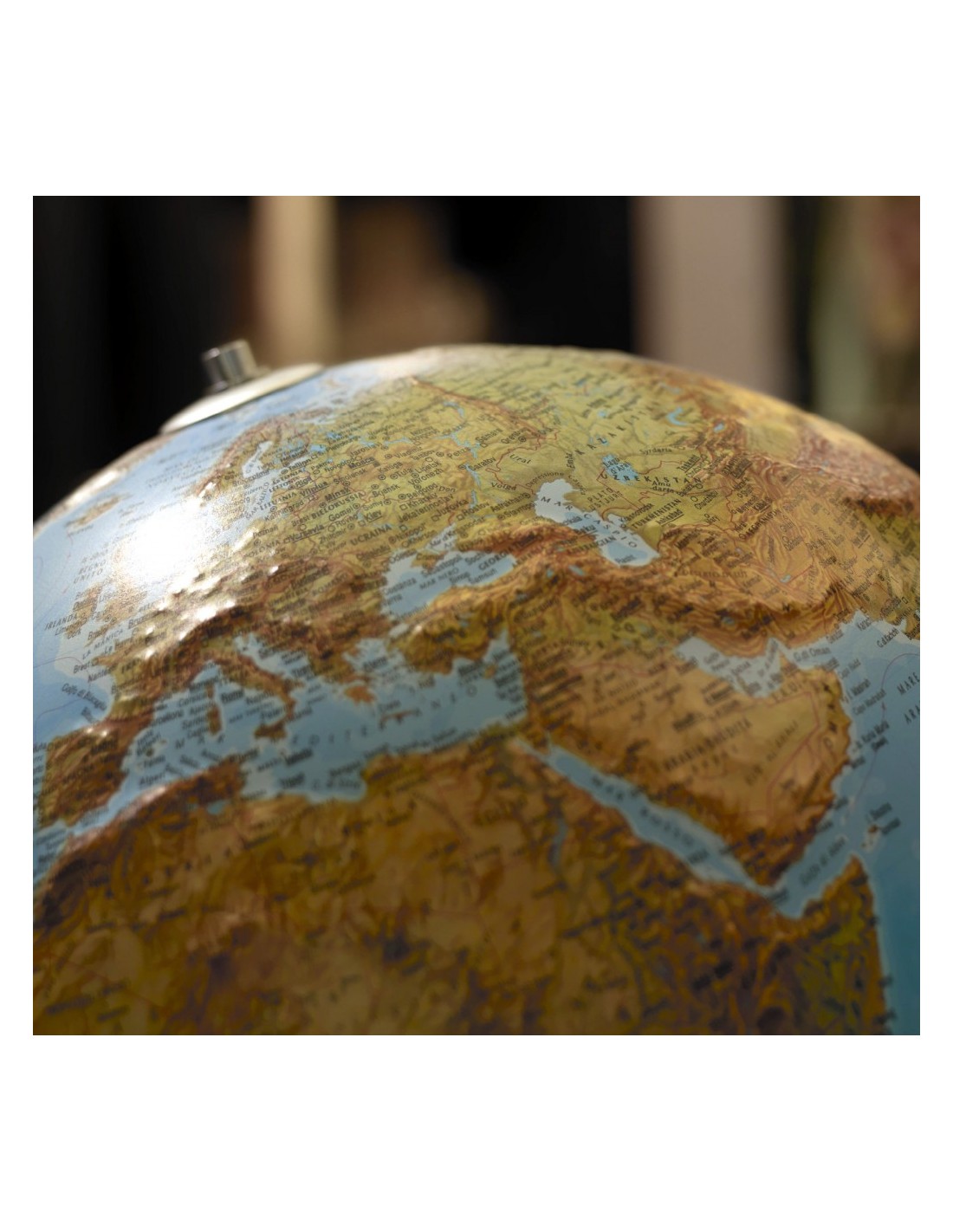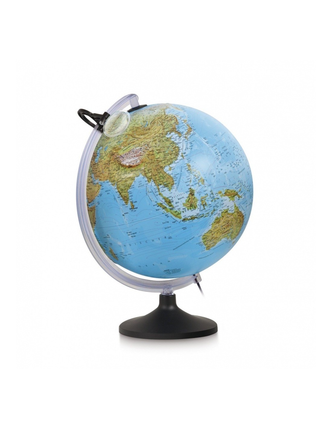 Glob geografic Uranio cu diametrul de 30 cm, in relief. Globul are cartografia in limba engleza. Ofera doua vizualizari ale Pamantului, fizica si politica si o experienta vizuala si tactila realista. Dealurile si muntii intr-un relief precis. Globul este iluminat prin lumina electrica si urmeaza masurile de securitate impuse de Uniuna Europeana.Cablul are lungimea de 150 cm.