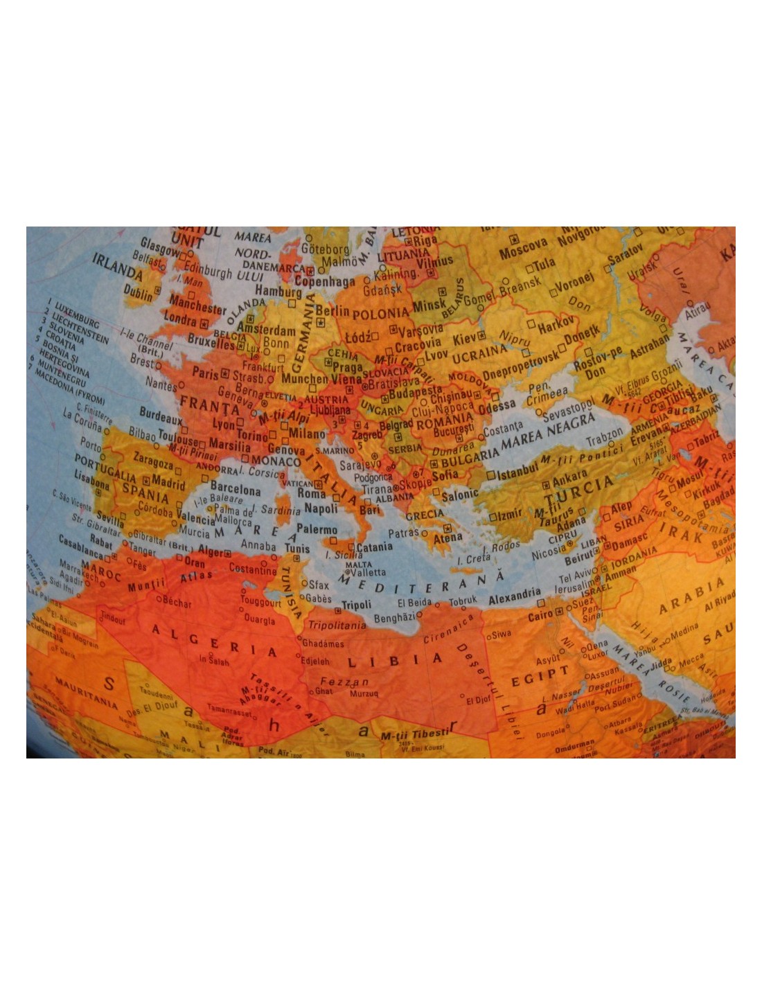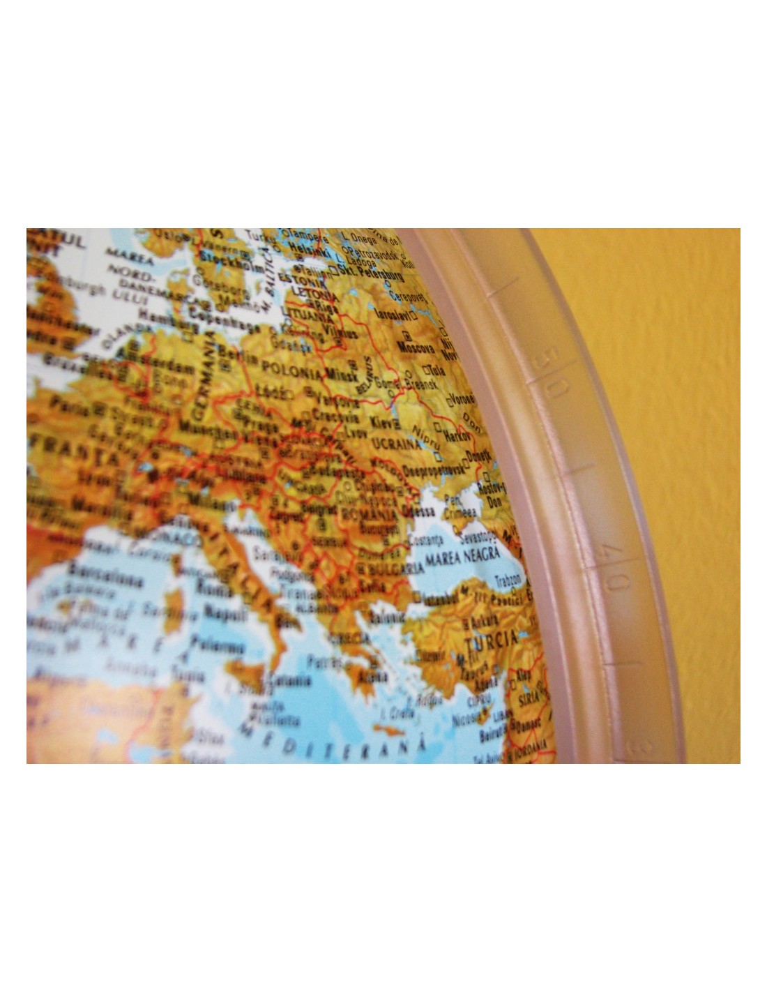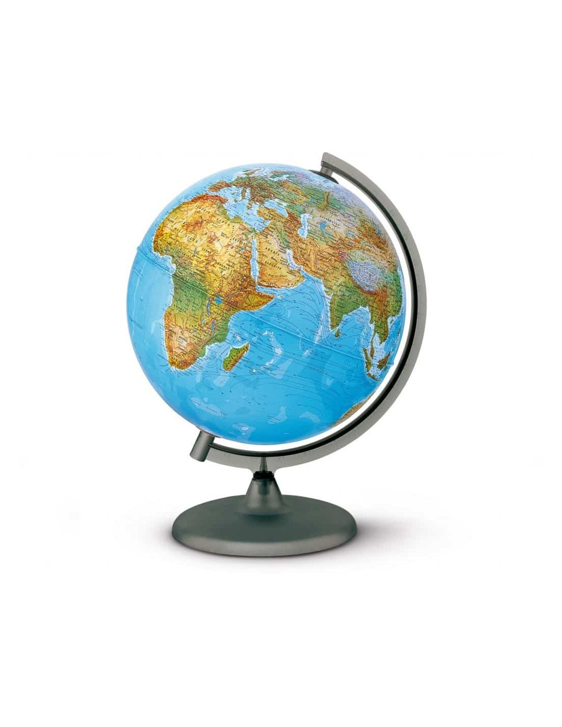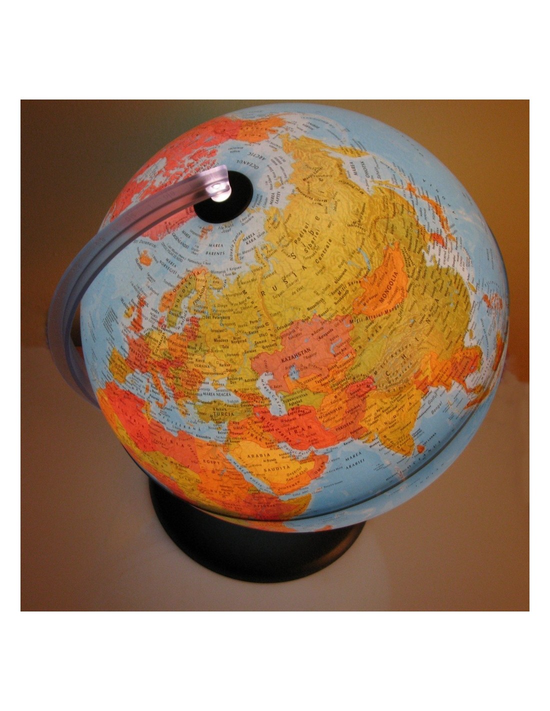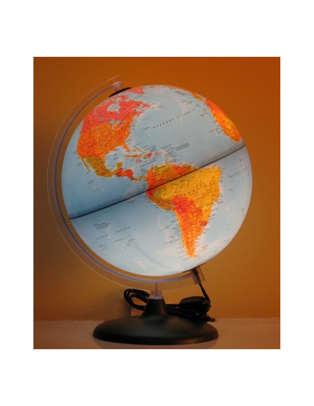 Glob geografic cu diametrul de 30 cm. Globul are inscriptii in limba romana. Ofera doua vizualizari ale Pamantului, fizica si politica. Globul este iluminat din interior, cu un bec, alimentat la tensiunea de 230V c.a., cu respectarea normelor de securitate din Uniuna Europeana. Cablul are lungimea de 150 cm. Cand becul este stins harta este fizica. Culorile identifica vegetatia, galben pentru deserturi, verde pentru paduri. Cand becul este aprins harta devine politica. Fiecare tara este identificata printr-o culoare diferita fata de tarile vecine. Baza asigura o buna stabilitate, meridianul de referinta asigura pozitionarea corecta fata de axa pamantului, o rotire usoara si are gradate indicatiile de latitudine. Acest produs este unul dintre globurile noastre cele mai populare si vandute, datorita si raportului foarte bun pret/calitate. Potrivit in diverse situatii el poate fi consultat pentru a invata geografie intr-un mod placut. Poate da un plus de fascinatie camerei unui copil sau poate constitui un punct de interes intr-un birou, datorita constructiei tip veioza. [embeddoc url="https://materialedidactice.ro/wp-content/uploads/2013/12/ORION.pdf"]