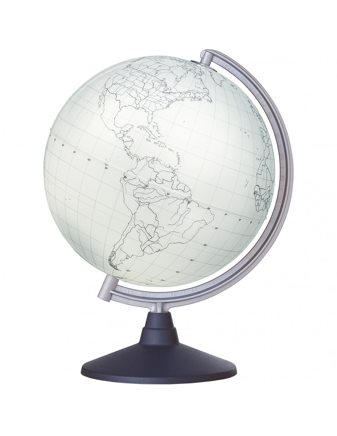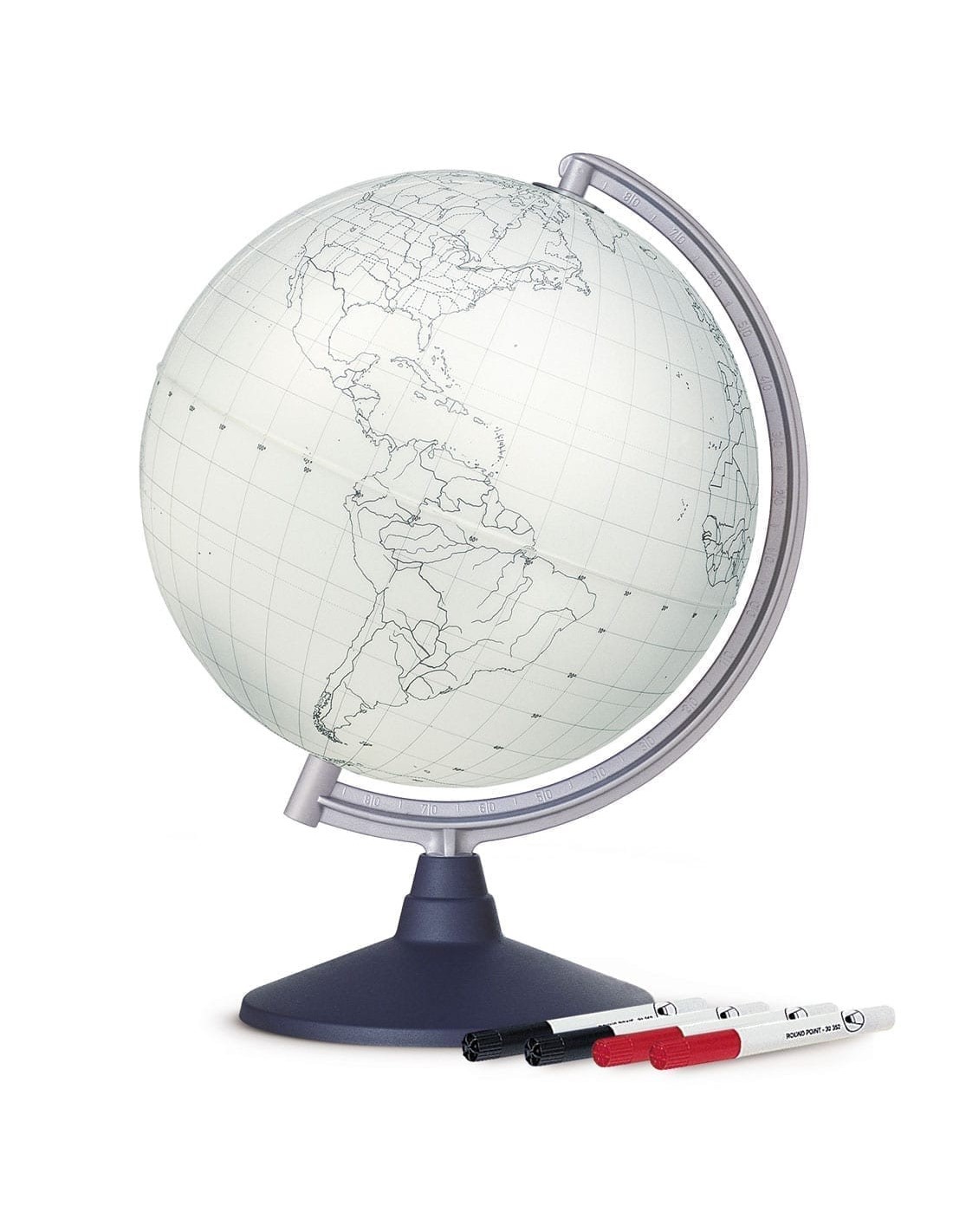 Un glob simplu, minimal in detalii cartografice, ce permite scrierea cu marker si stergerea ca pe o tabla white board. 4 markere, 2 rosii si 2 negre sunt incluse.