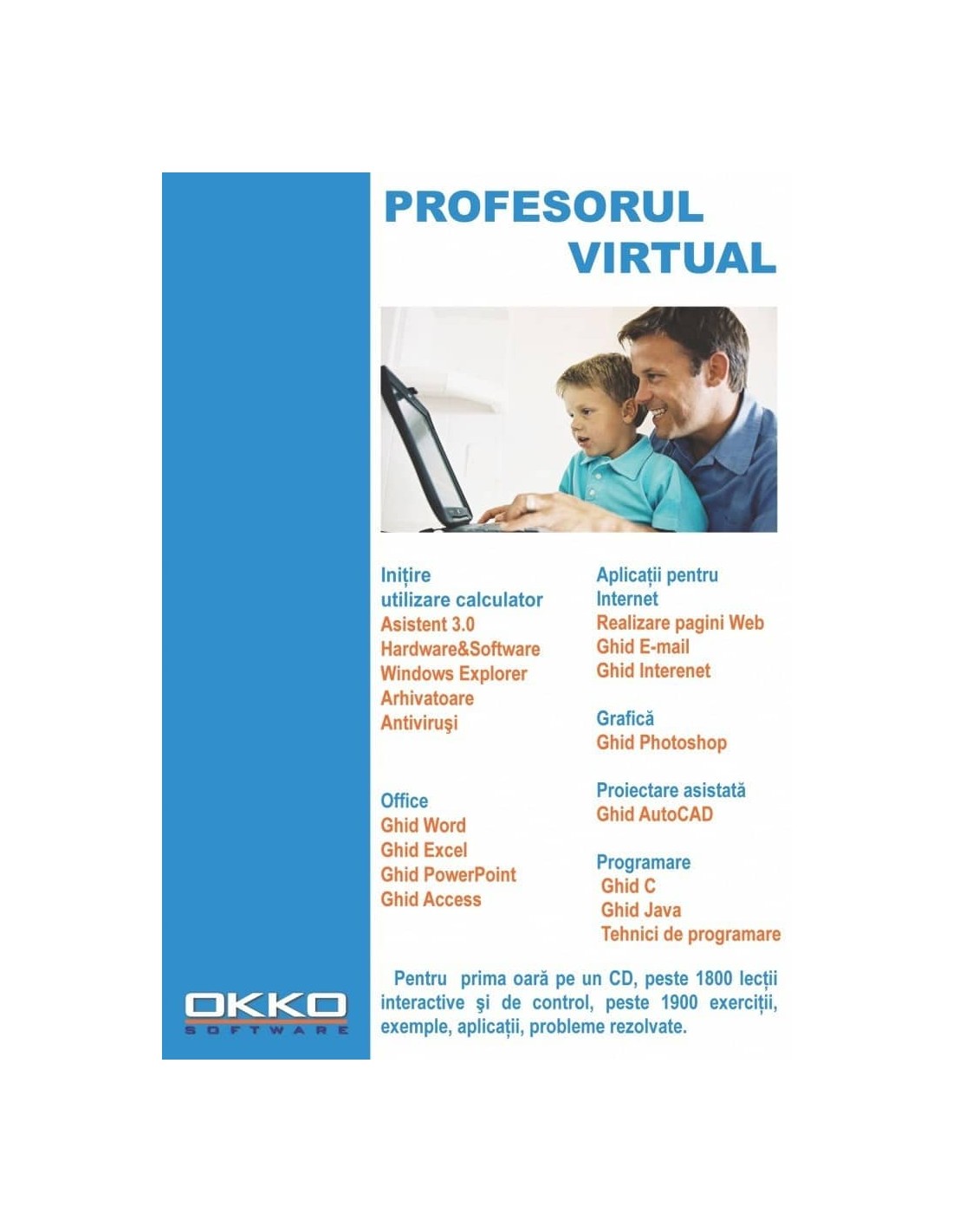 Contine cursuri interactive din domeniile: Sisteme de operare, Limbaje de programre, Baze de date, Editare texte, Calcul tabelar, Grafica, Proiectare asistata, Internet, Pagini Web, Hardware si Utilitare. CD-ul contine 2240 lectii, 1330 exercitii, 658 exemple, 512 probleme rezolvate, 55 aplicatii.