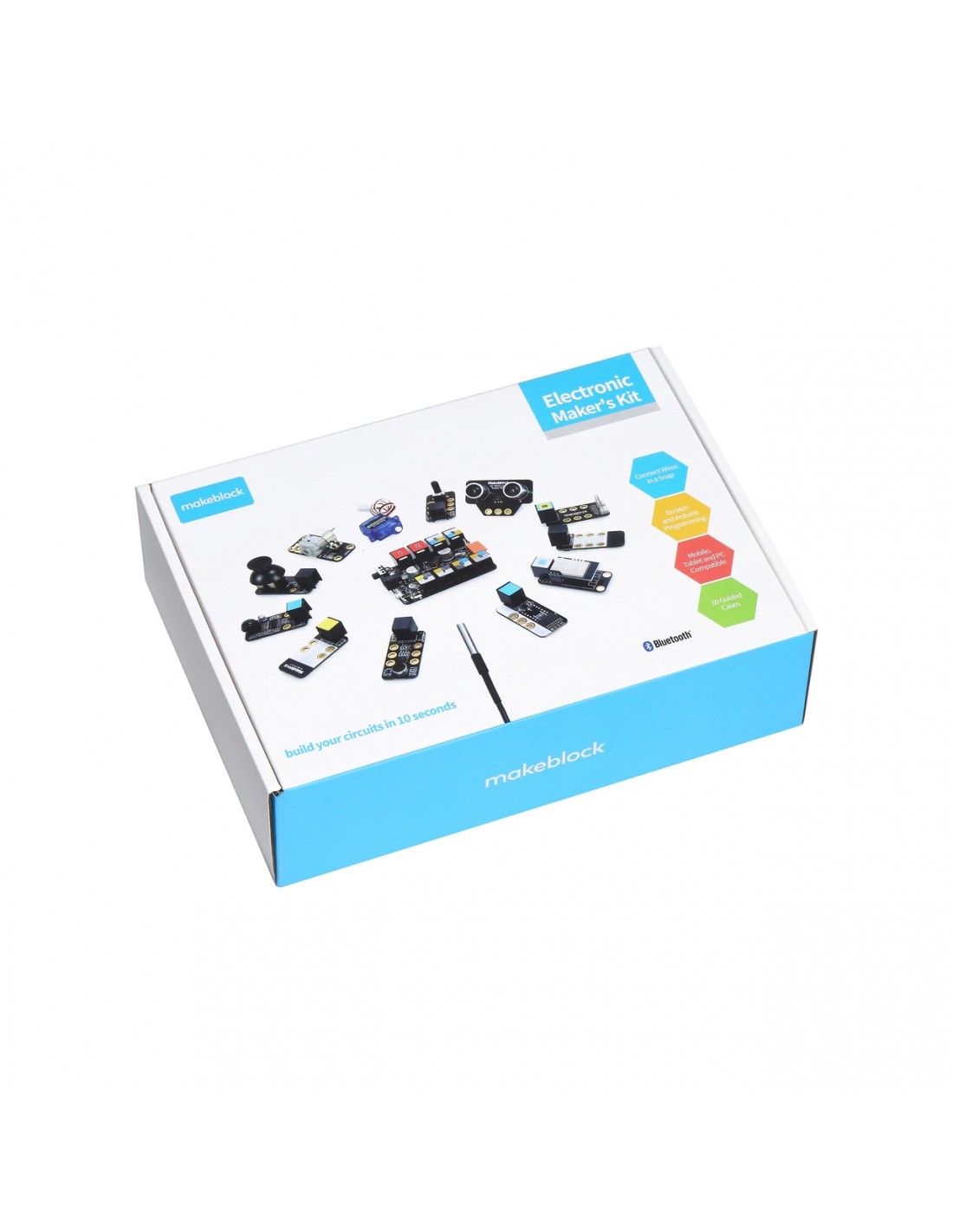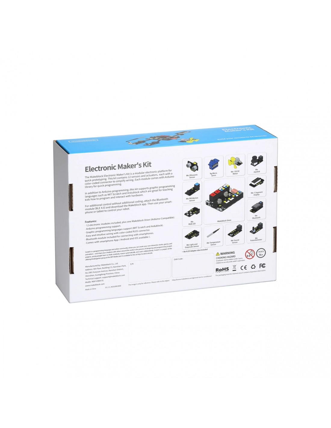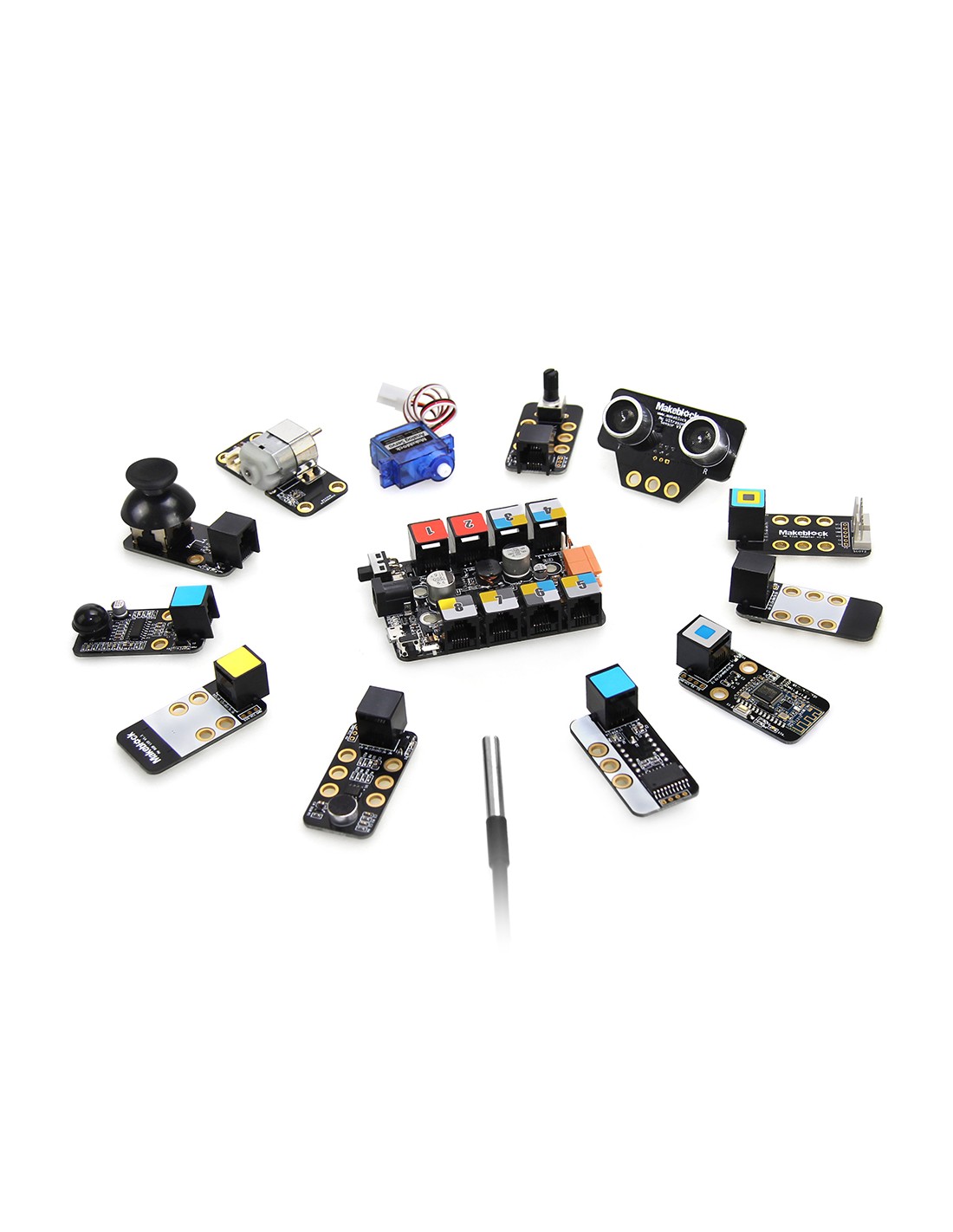 Kit cu 12 module electronice incluse, plus un Makeblock Orion (compatibil cu Arduino).
