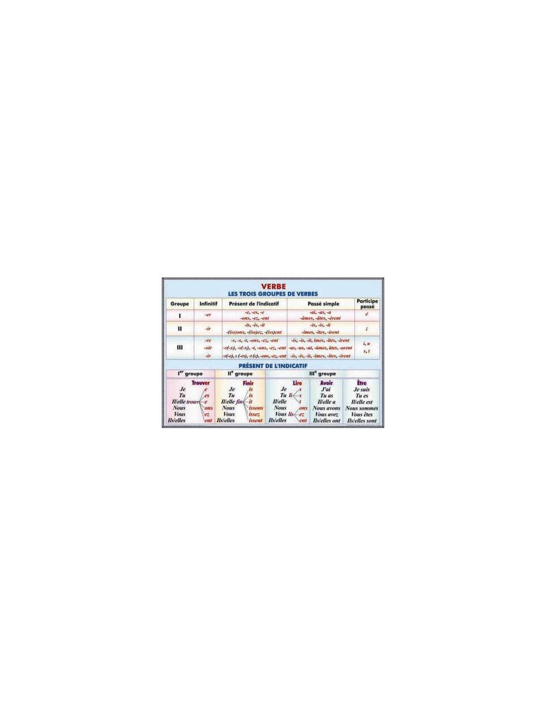 Verbe.Les trois groupes de verbes. Present de l'indicatif./Tableau de determinants. Articles. Adjectifs. Pronoms indefinis
