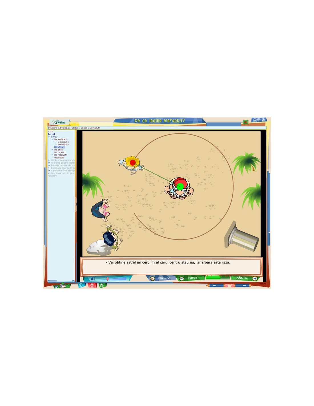Geometrie clasa a VII-a “De ce leşină elefanţii?” este destinat tuturor elevilor care studiază cercul: Cercul; Unghi la centru şi unghi înscris în cerc; Teoreme despre coarde şi arce de cerc; Poziţiile relative ale unei drepte faţa de un cerc; Poziţiile relative a doua cercuri; Poligoane înscrise în cerc; Calcularea unor elemente în poligoanele regulate; Lungimea cercului şi aria discului; Patrulatere inscriptibile
