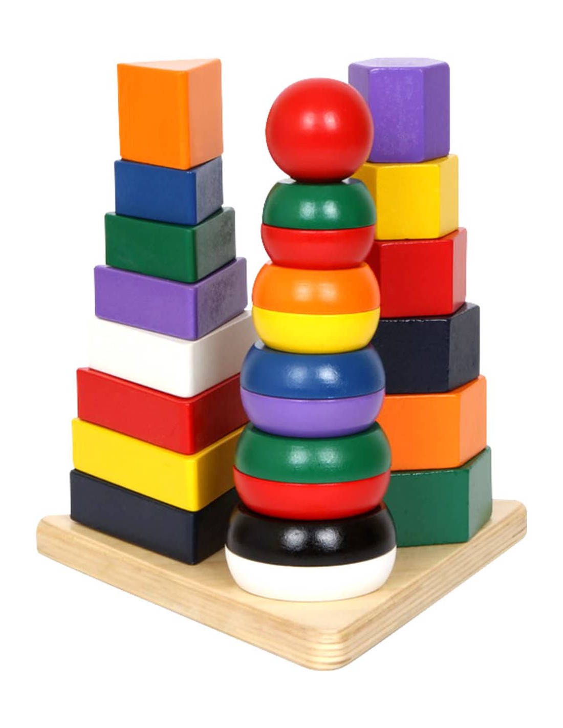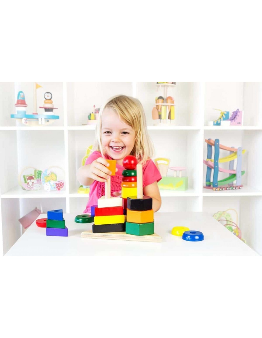 3 piramide puzzle de lemn cu 25 de piese de potrivit si stivuit pe suporturile lor - o combinatie fascinanta de inele, octogoane si corpuri rectangulare!