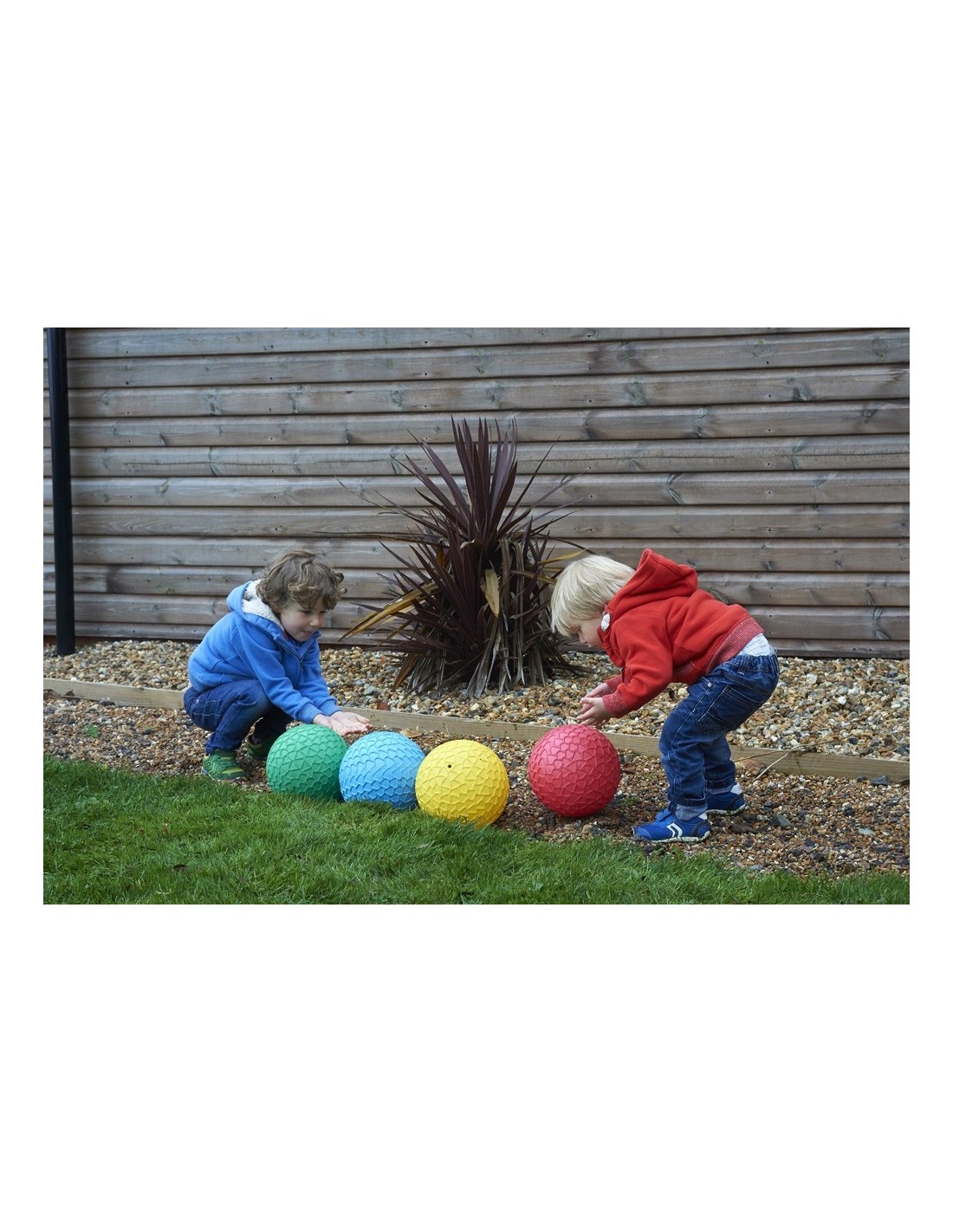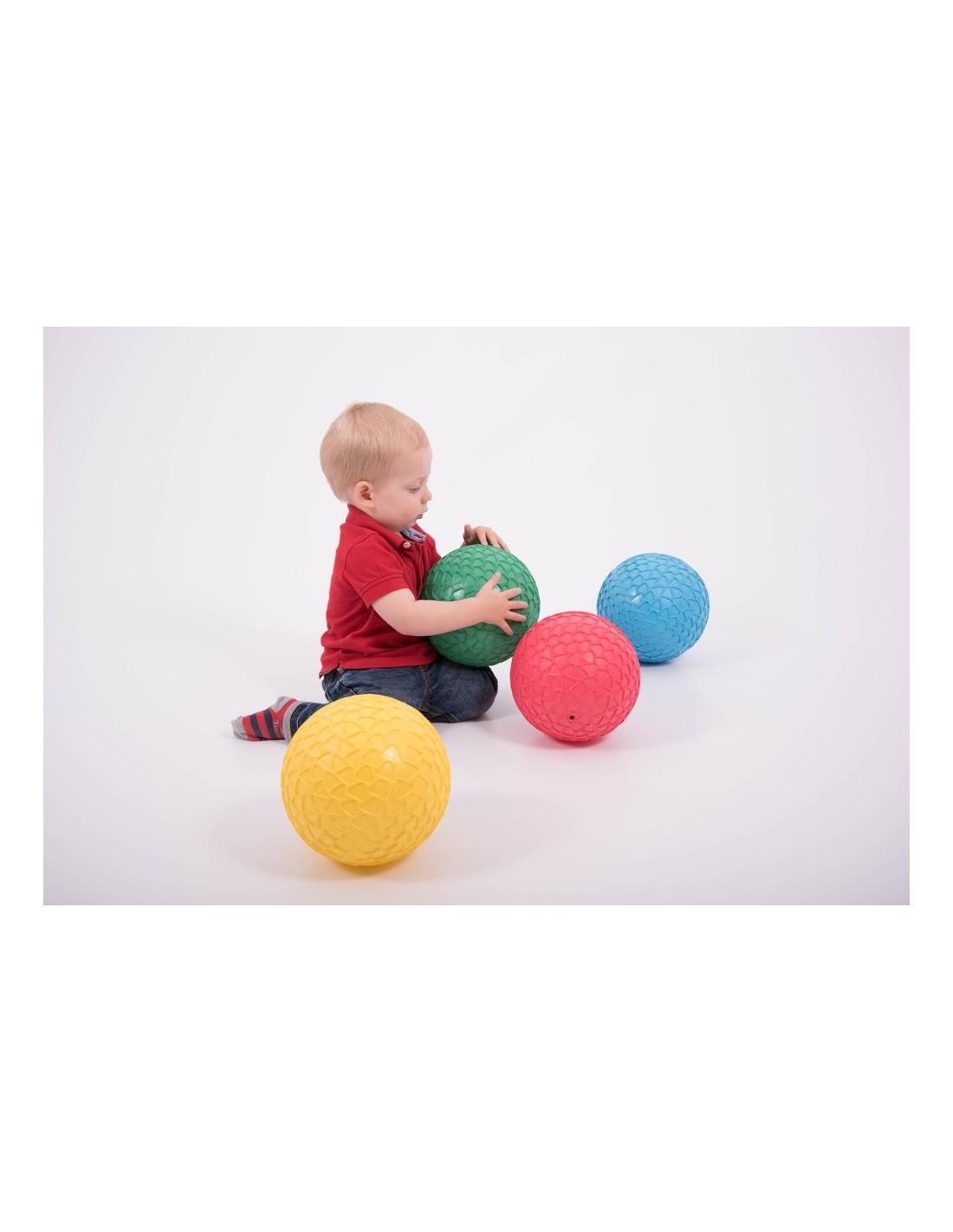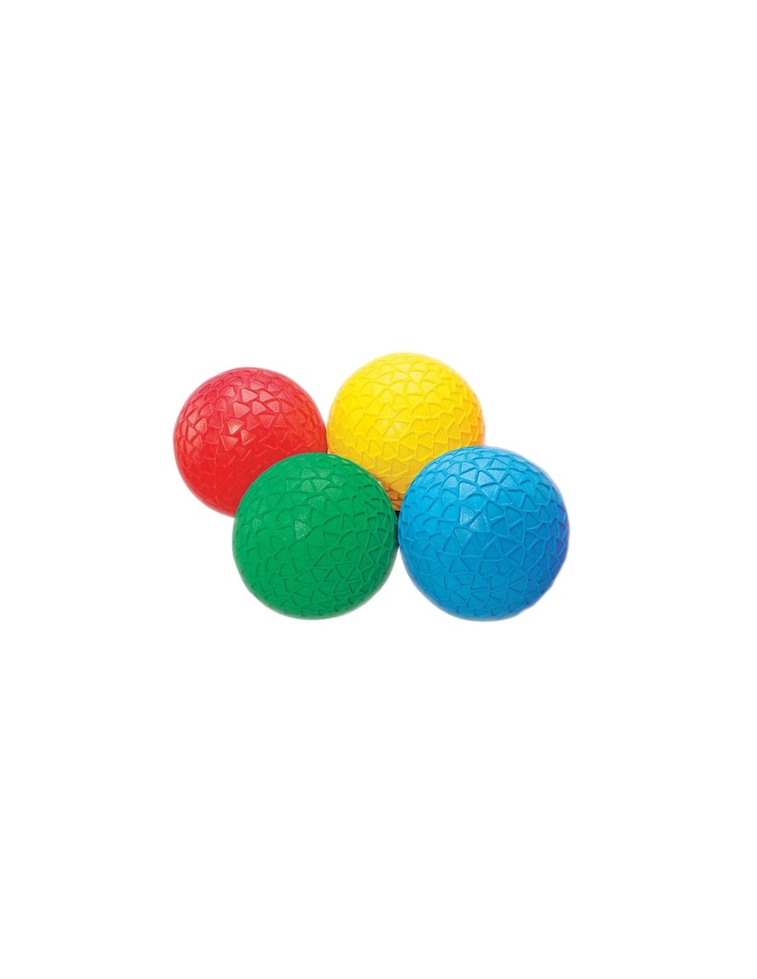 Set de 4 mingi senzoriale gonflabile, în 4 culori (roșu, verde, albastru și galben) cu textură fagură de miere care ajută prinderea la aruncare și prindere. Mingile sunt ușoare, dar robuste și au o dimensiune care permite și copiilor mici să se joace cu ele, mărind încrederea copiilor la îndemânarea mingii și coordonarea mână-ochi.