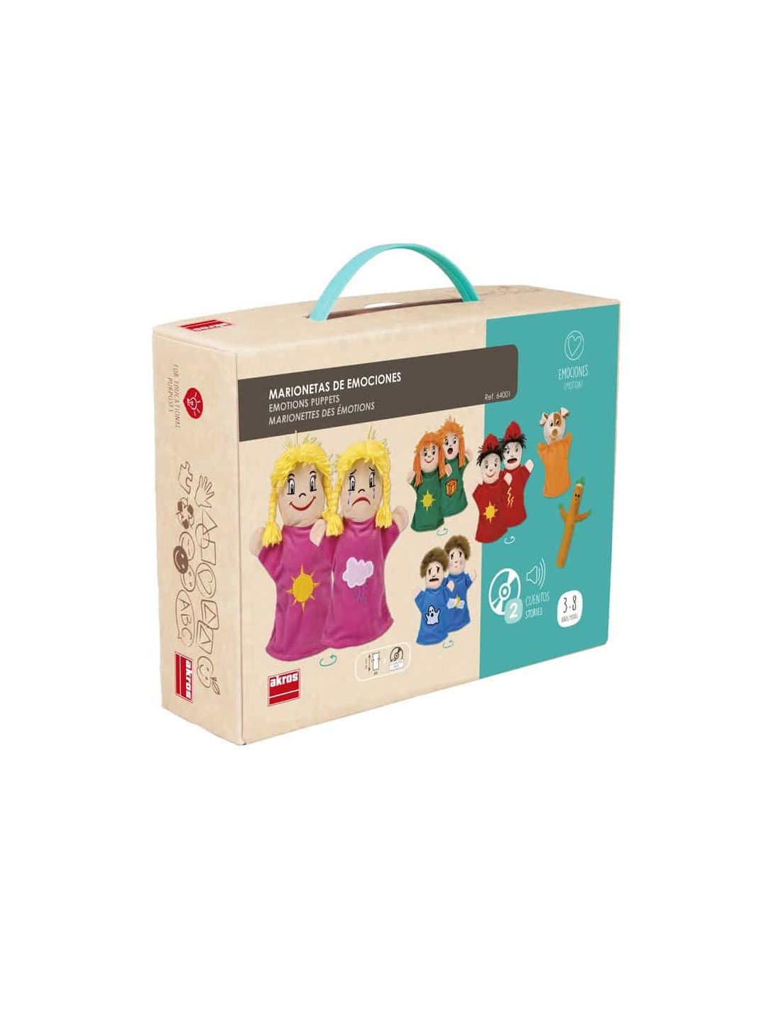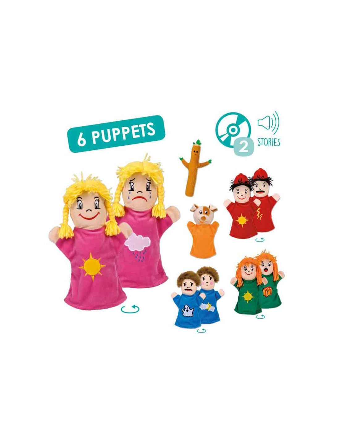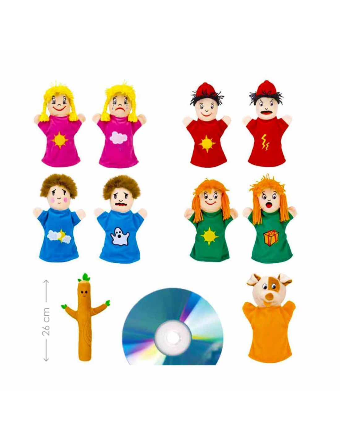 Set de 6 marionete (4 sunt reversibile cu doua fețe diferite) plus un CD audio MP3 ce conține o serie de 2 povești complete cu mizica și dialoguri.